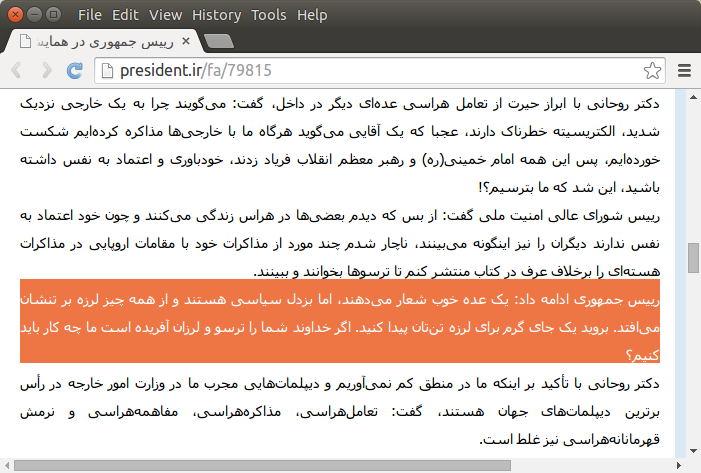 گویا این سخنان از دید زیردستان آقای رئیس جمهور نیز آنقدر زشت بوده که حتی پایگاه اطلاع رسانی ریاست جمهوری نیز ترجیح داد ادبیات آقای روحانی را با قدری تلطیف [بخوانید: سانسور] منتشر کند: