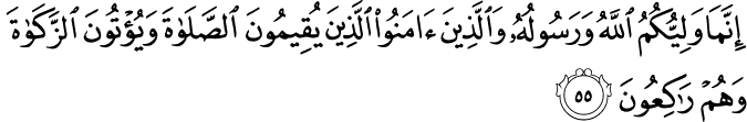 سرپرست و رهبر شما تنها خدا و پیامبرش و کسانی اند که ایمان آورده اند، همانان که نماز برپا می دارند و در حال رکوع زکات می دهند.
