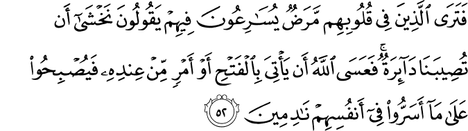 پس می بینی آنان که در دل هایشان بیماری (شک و تردید) است، برای طرح دوستی بسوی آنان (یهودیان و مسیحیان) می شتابند، و می گویند: «می ترسیم گرفتار حصر و تحریم شویم»؛ و چه بسا خداوند (برای مومنان) پیروزی پدید آورد و یا از جانب خود امری پدیدار سازد، آنگاه آنان (بیماردلان سست ایمان) از آنچه (در دوستی با یهودیان و مسیحیان) در دل هایشان نهان می داشتند پشیمان خواهند شد.